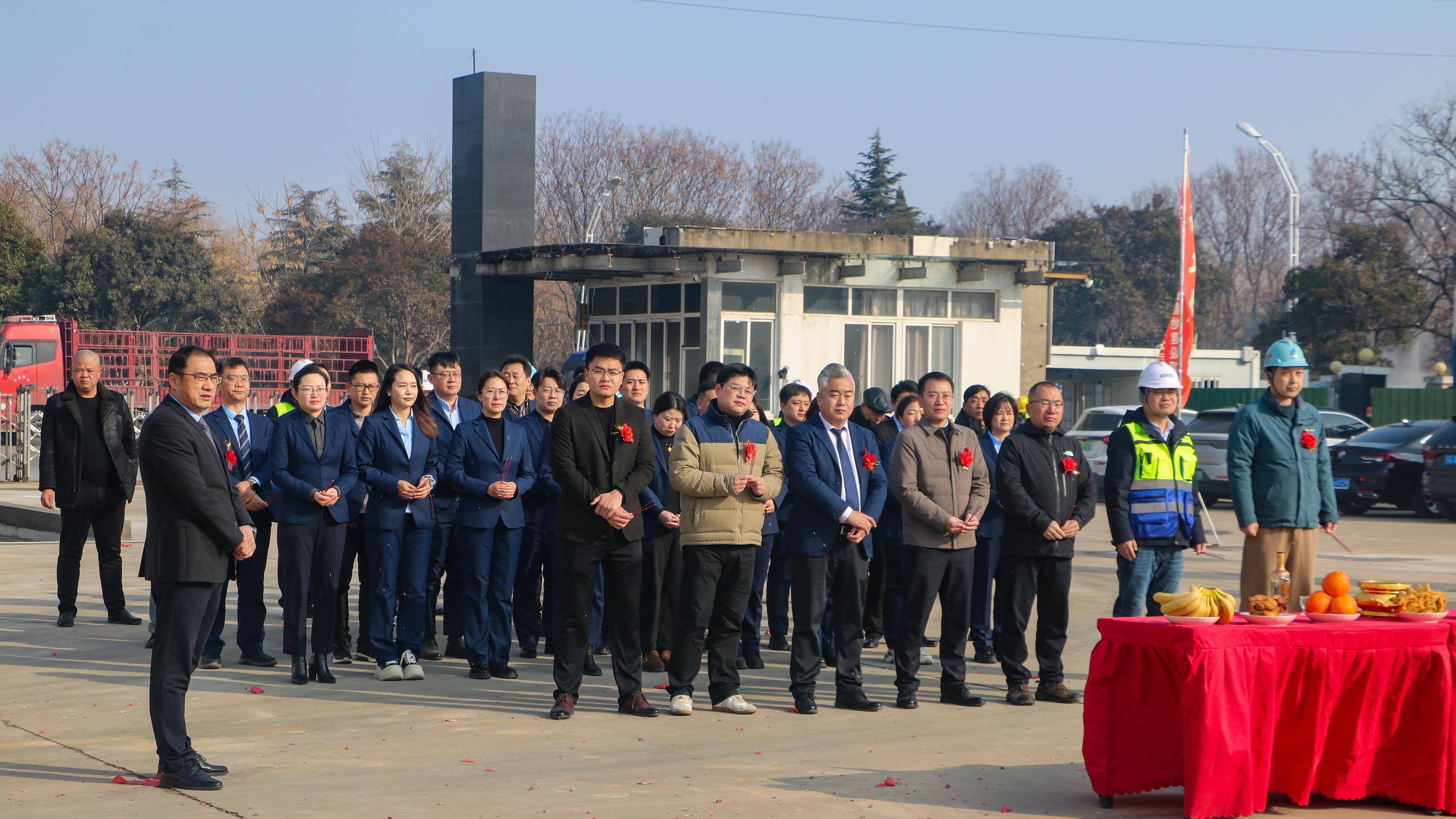 上午仪式在庄重而热烈的氛围中拉开帷幕。随后,为祈愿工程顺利、企业平安,现场举行了传统祭拜仪式。在主祭人刘总的带领下,众人肃立行礼,表达对天地万物的敬畏之心与对项目未来的美好期盼。
